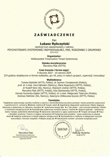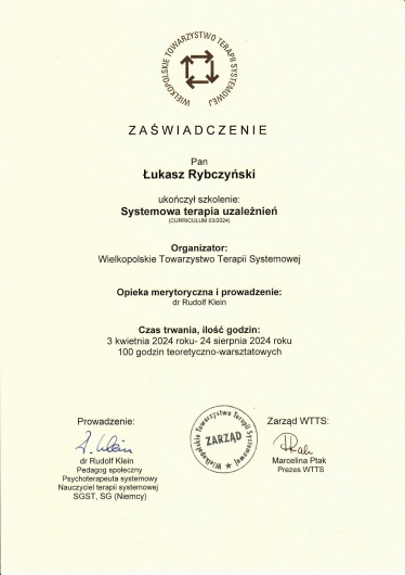 Swoje doświadczenia od lat zdobywam w Lubuskim Ośrodku Profilaktyki i Terapii Uzależnień oraz Współuzależnień w Zielonej Górze. Ciągle się dokształcam i pozostaję na bieżąco z panującymi trendami obowiązującymi w psychologii oraz psychoterapii, należę do Wielkopolskiego Towarzystwa Terapii Systemowej, w którym szkolę się i poszerzam swoje horyzonty. Ukończyłem w nim kurs podstawowy oraz zaawansowany psychoterapii systemowej, rozszerzony moduł psychoterapii systemowej uzależnień oraz biorę aktywnie udział w warsztatach, doświadczeniach własnych oraz superwizjach indywidualnych oraz grupowych.