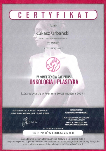 Mimo uzyskania dwóch specjalizacji cały czas podnoszę swoje umiejętności zawodowe poprzez udział w konferencjach i warsztatach. Szczególnie interesuje się chirurgią onkoplastyczną i rekonstrukcyjną, diagnostyką nowotworów skóry (dermatoskopia) oraz chirurgią minimalnie inwazyjną.