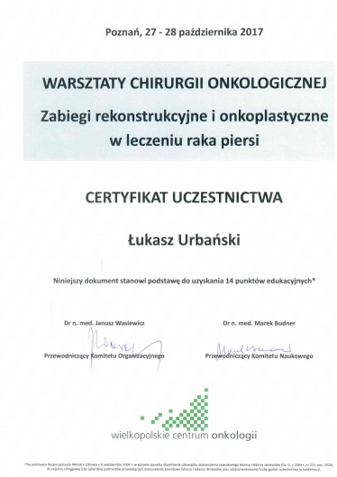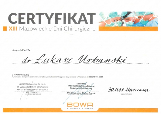 Jaki jest zakres porad oferowanych przez Łukasz Urbański?Łukasz Urbański to chirurg, chirurg onkologiczny. Na podstawie swojego doświadczenia i wykształcenia Łukasz Urbański oferuje usługi takie jak: Konsultacja chirurgiczna, badanie piersi, badanie per rectum, chirurgiczne opracowanie odleżyn, kwalifikacja do operacji, usuwanie zmian skórnych, usuwanie znamion, tłuszczaków, kaszaków, włókniaków, usuwanie zmian nowotworowych, usuwanie szwów, drobne zabiegi chirurgiczne.
