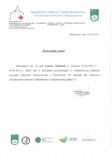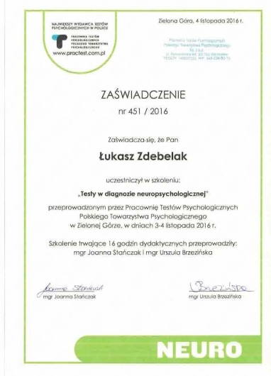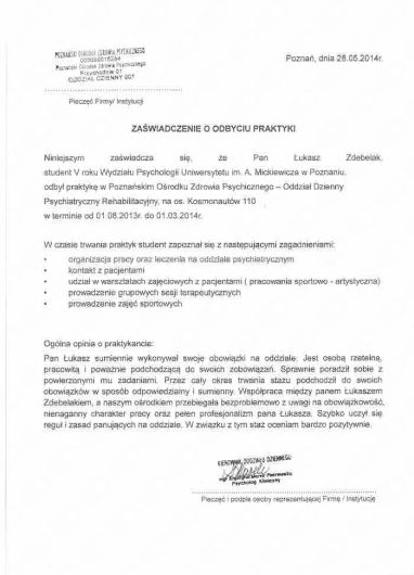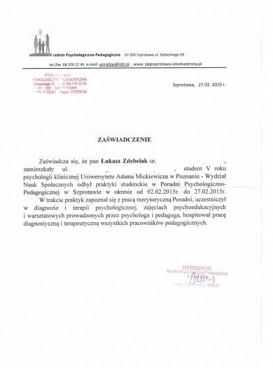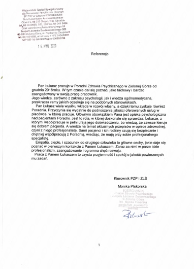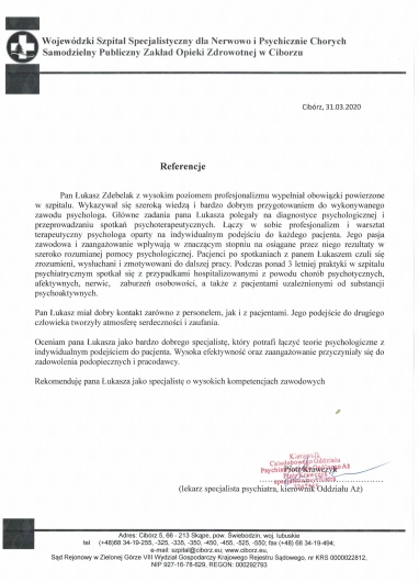 Doświadczenie zawodowe zdobywam od 2015 roku. Bardzo cenię sobie ponad 3 letnią pracę w Wojewódzkim Szpitalu Specjalistycznym dla Nerwowo i Psychicznie Chorych SPZOZ w Ciborzu . Właśnie tam zobaczyłem pełne spektrum zaburzeń psychicznych i pracę z nimi. Doświadczyłem również jak zaburzenia i choroby psychiczne mogą mocno zdezorganizować życie człowieka. Pracowałem również w Poradni Zdrowia Psychicznego w Zielonej Górze. Przeprowadzałem testy psychologiczne i prowadziłem psychoterapię. W mojej karierze od początku również współpracuję z różnymi placówkami prywatnymi.