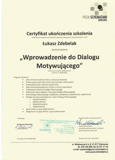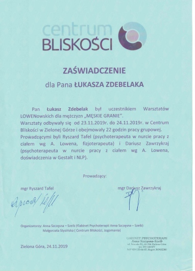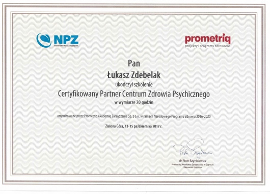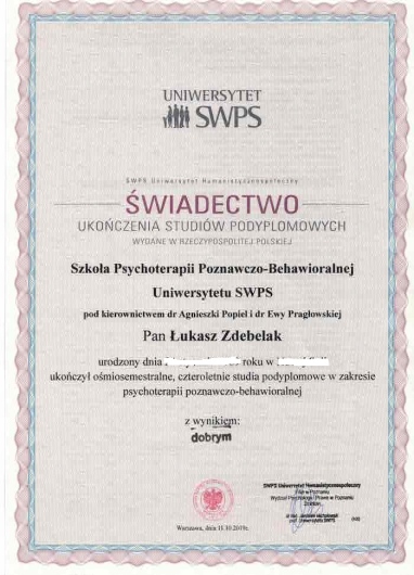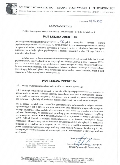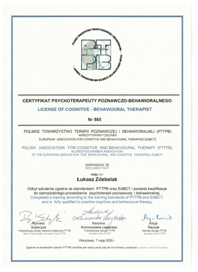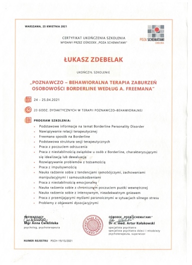 Jaki jest zakres porad oferowanych przez Łukasz Zdebelak?Łukasz Zdebelak to psycholog, psychoterapeuta certyfikowany. Na podstawie swojego doświadczenia i wykształcenia Łukasz Zdebelak oferuje usługi takie jak: konsultacja online, psychoterapia dorosłych, Psychoterapia poznawczo-behawioralna, Konsultacja psychologiczna, Konsultacja psychologiczna online, Psychoterapia, psychoterapia indywidualna, Psychotherapeutic Counselling in English, psychotherapy in English.