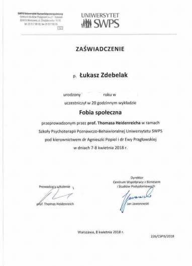 Po terapii nie mam z tym problemu, jestem w stanie poradzić sobie z lękami i normalnie rozmawiać i nawiązywać relacje z ludźmi, a ponadto przestałem siebie negatywnie oceniać, że jestem najgorszy, nikt mnie nie zechce, że nie jestem wartościowy itd.