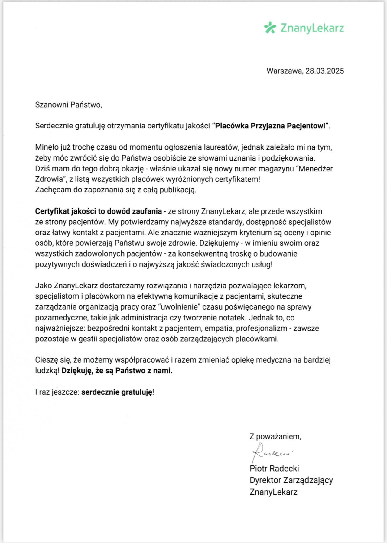Administratorem danych osobowych jest ZnanyLekarz sp. z o.o. z siedzibą w Warszawie przy ul. Kolejowej 5/7. Informujemy, że po przekazaniu przez nas Twoich danych osobowych wybranemu przez Ciebie Profesjonaliście, staje się on również administratorem Twoich danych osobowych i przetwarza je w celach związanych ze świadczeniem usług medycznych lub innych podobnych.