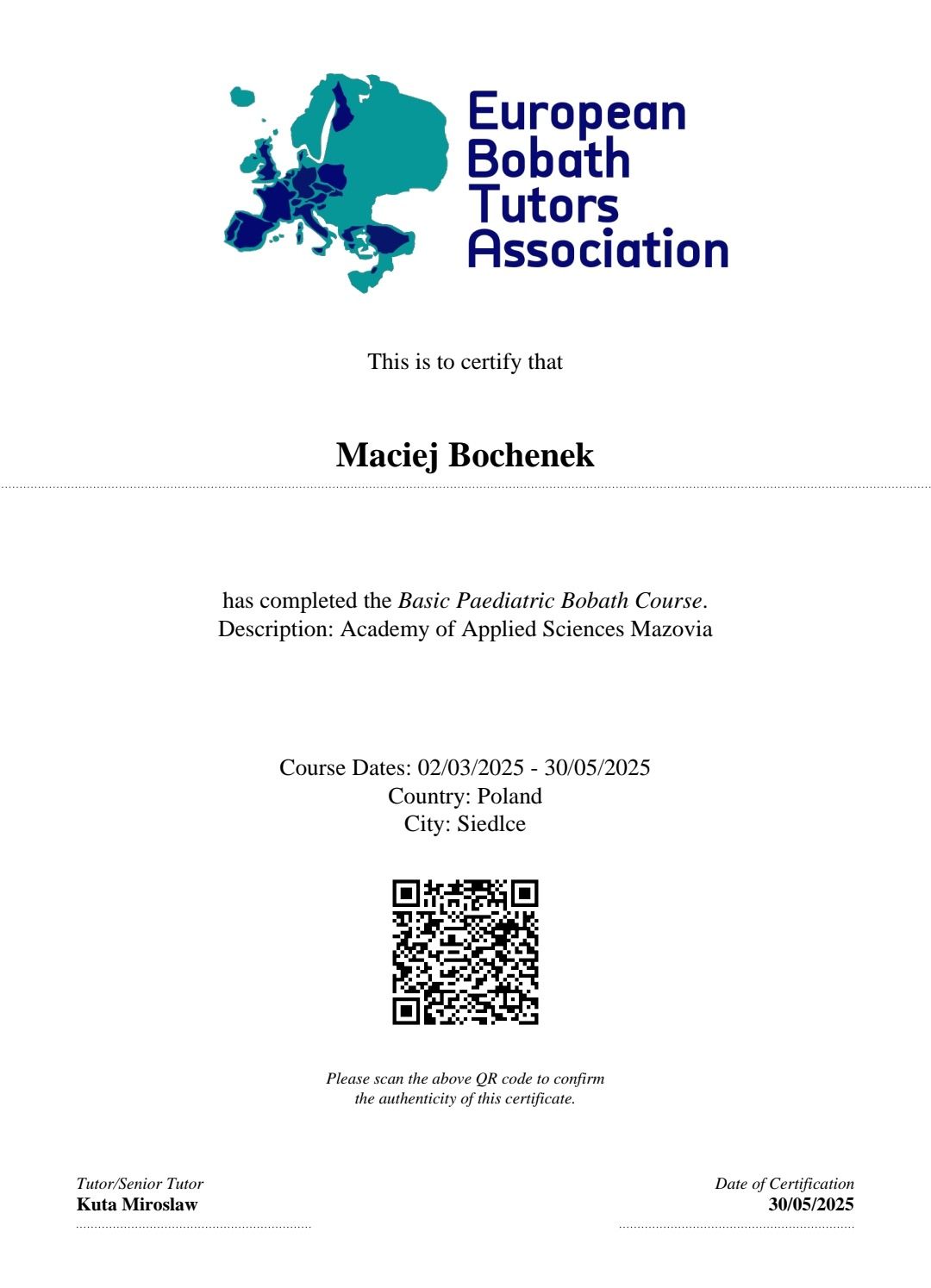 Pan Maciej jest bardzo kompetentnym terapeutą z dużym zasobem wiedzy i doświadczeniem. Wszystko dokładnie tłumaczy i zadaje proste ćwiczenia, które można stosować w domu. Dodatkowo jest terapeutą NDT Bobath. Bardzo polecam na wizytę diagnostyczną z dzieckiem oraz terapię u tego specjalisty.