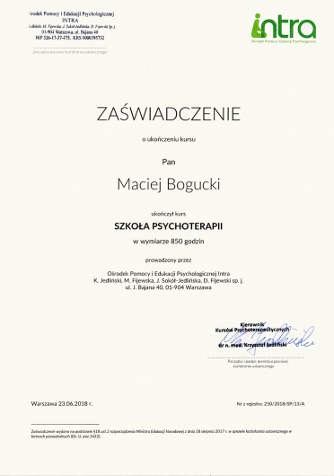 Maciek to bardzo empatyczny psychoterapeuta potrafiący wysłuchać drugą osobę. Na sesjach zawsze panowała przyjazna atmosfera zachęcająca do otwartości, idąc do niego otrzymujesz sporo przestrzeni. Maciek potrafi dobrze rozpoznać problemy i odpowiednio nakierować pracę, dając jednak przy tym dużo swobody osobie, która przychodzi na terapię. Chodziłem do Maćka przez ponad rok i wspólnie bardzo dobrze przepracowaliśmy ten czas. Uważam, że wybór Maćka był świetną decyzją.