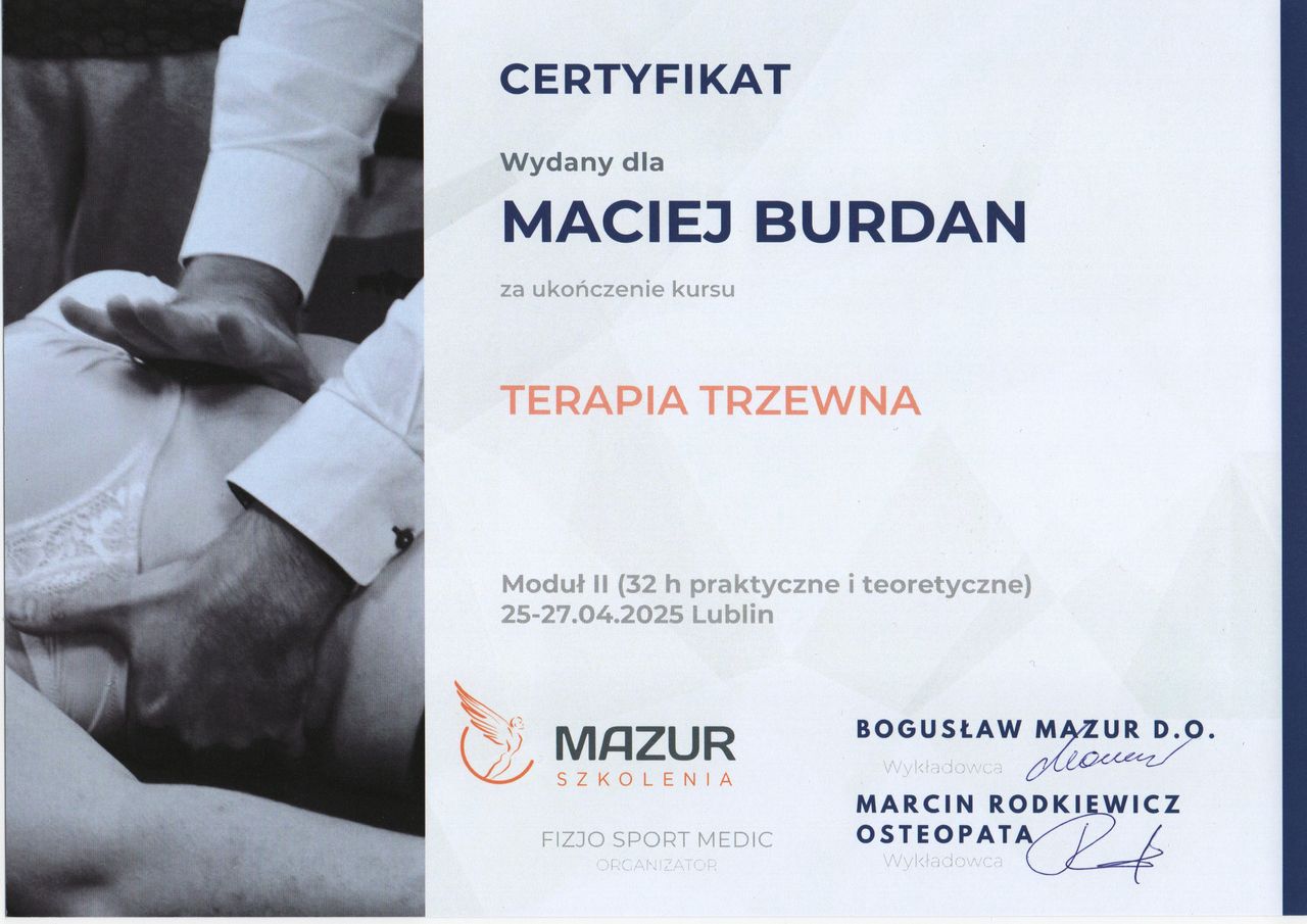 Jaki jest zakres porad oferowanych przez Maciej Burdan?Maciej Burdan to fizjoterapeuta. Na podstawie swojego doświadczenia i wykształcenia Maciej Burdan oferuje usługi takie jak: konsultacja fizjoterapeutyczna (pierwsza wizyta), konsultacja fizjoterapeutyczna, Wizyta domowa, rehabilitacja dzieci, terapia wisceralna, rehabilitacja, rehabilitacja sportowców, konsultacja online.