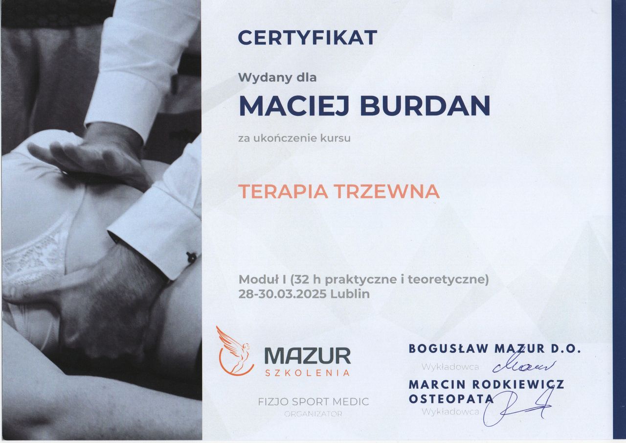 Czy Maciej Burdan przyjmuje online, bez konieczności pojawiania się w placówce?Tak, Maciej Burdan oferuje konsultacje online. Wybierz opcję „konsultacja online” przy umawianiu wizyty, a zobaczysz dostępne terminy.