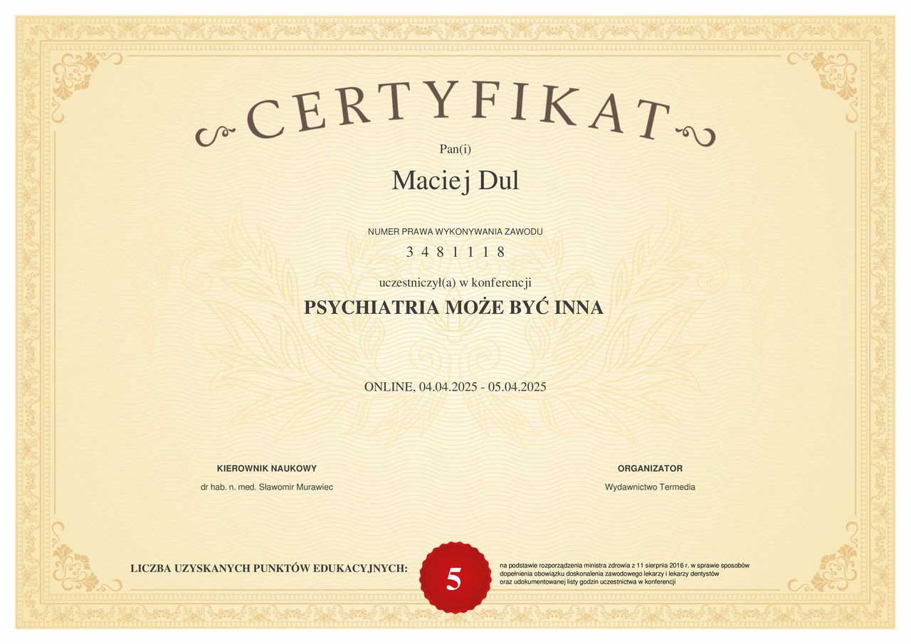 Zdałem Państwowy Egzamin Specjalizacyjny w dziedzinie psychiatrii z wynikiem bardzo dobry uzyskując jeden z najwyższych wyników w kraju. Rozwijam się zawodowo uczestnicząc w konferencjach, dyskusjach klinicznych oraz regularnie czytając literaturę z dziedziny psychiatrii co daje gwarancję bieżącej aktualizacji wiedzy by móc pomagać pacjentom w sposób jak najbardziej efektywny i bezpieczny. Zajmuję się diagnostyką i leczeniem zaburzeń psychicznych w całym zakresie, w szczególności zaburzeniami nastroju, związanymi ze stresem, zaburzeniami lękowymi (cały zakres nerwic). Diagnostyka i leczenie ADHD.