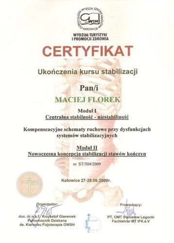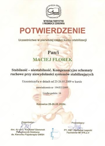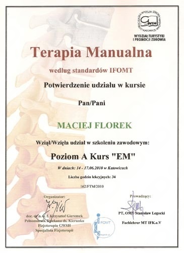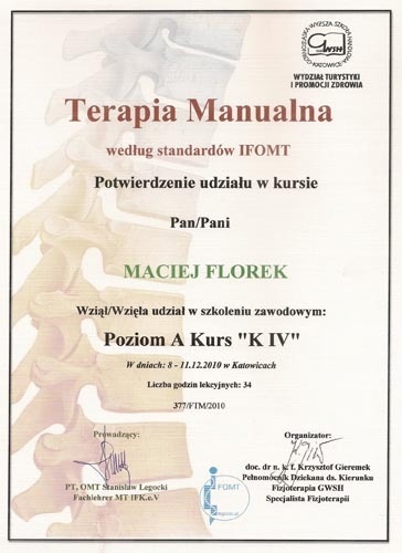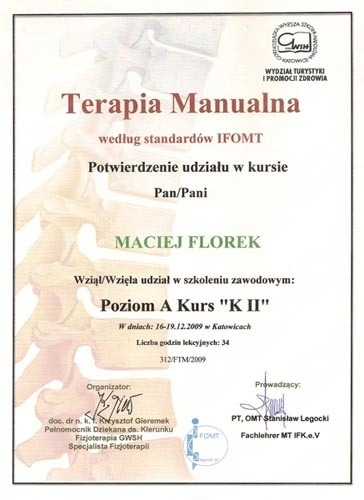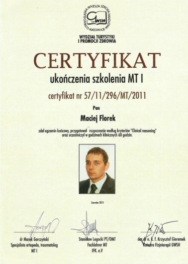 - Dyplomowany Terapeuta Manualny MT I wg standardów IFOMT