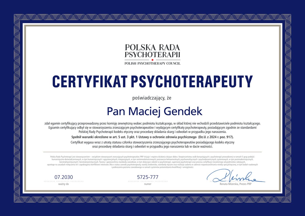 Jestem psychologiem oraz certyfikowanym psychoterapeutą (w podejściu psychologii procesu): posiadam dyplom International Association of Process Oriented Psychology, a także certyfikat psychoterapeuty Polskiej Rady Psychoterapii oraz Polskiego Stowarzyszenia Psychoterapeutów i Praktyków Psychologii Procesu. Pracuję w gabinecie oraz on-line. Link do moich uprawnień psychoterapeutycznych Zapraszam m.in. osoby z trudnymi decyzjami dotyczącymi kontynuowania lub zmiany formy relacji (ślub, rozwód), doświadczające stresu w relacjach z ludźmi oraz psychologicznymi aspektami różnych problemów związanych z ciałem (psychosomatyka). Pracuję w podejściu psychologii zorientowanej na proces – oznacza to, że na sesjach skupiamy się na tym, żeby odnaleźć i dopuścić do siebie ożywczy, odblokowujący klienta bądź klientkę proces, który często płynie poza słowami i świadomymi, przemyślanymi rozwiązaniami, które z jakiegoś powodu nie rozwiązują dotychczasowych kłopotów. Niezależnie od tego jak trudne sytuacje spotykają nas w życiu, w relacjach z innymi ludźmi, jest w nich zawarta informacja, która – umiejętnie wykorzystana – może posłużyć za pierwszy krok na drodze do szczęśliwego życia. Mój certyfikat psychoterapeuty został wydany przez Polskie Stowarzyszenie Psychoterapeutów i Praktyków Psychologii Procesu po ukończeniu afiliowanego Programu Licencyjnego Instytutu Psychologii Procesu (IPP) w Warszawie - tam też regularnie superwizuję swoją pracę z klientami. Posiadam 20 letnie doświadczenie w pracy z osobami indywidualnymi, parami oraz rodzinami. Prywatnie oraz zawodowo interesuję się snami – różnymi sposobami w jaki można je interpretować. Regularnie publikuję artykuły o tematyce psychoterapeutycznej m.in. w Newsweek Psychologia (nr 1/23 o snach oraz 5/23 "Dlaczego robimy to, co robimy?") oraz na portalu - linki do nich można znaleźć w sekcji "Doświadczenie" pod zakładką "Publikacje i artykuły". Prowadzę terapię po polsku oraz po angielsku.