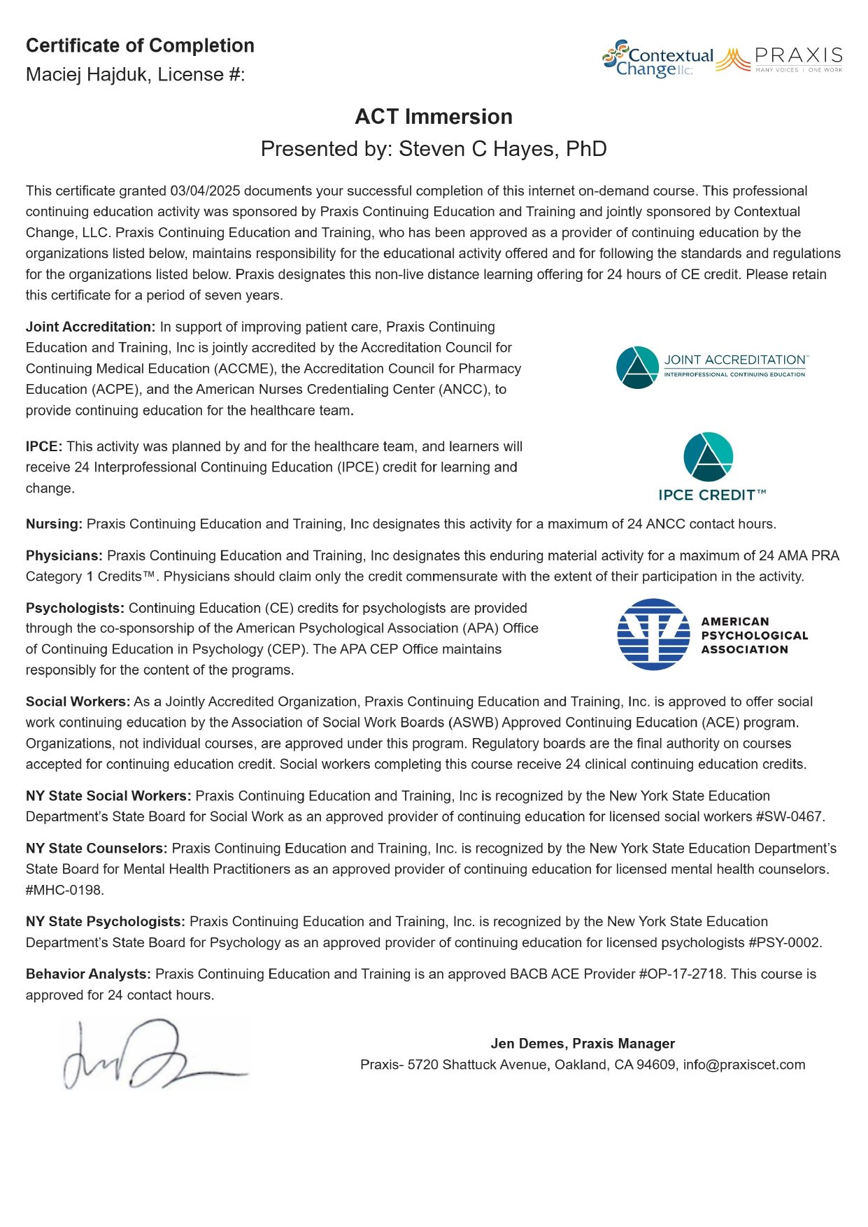 I feel lucky to have found such a compassionate and skilled English-speaking psychologist here in Wrocław, Mr. Hajduk. From the start, he took time to truly understand me. He was empathetic and thorough, especially in helping me manage panic attacks. The live exercises we did together made a real difference. He patiently guided me through practical techniques that I still use months later to handle panic and anxiety on my own. I always felt comfortable talking to him, which made it easier to open up and be honest. He was also very respectful of my needs, schedule, and how many sessions I could commit to. He tailored his support to fit my availability, which I deeply appreciated. That level of flexibility and understanding not only helped me make real progress, it also encouraged me to stay with therapy and commit to it fully. I truly recommend him to anyone seeking professional and compassionate mental health support.