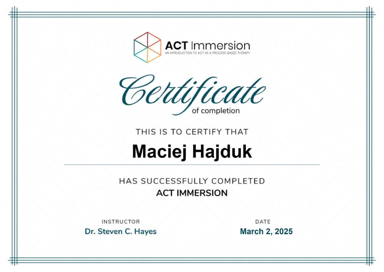 Pan Maciej to osoba empatyczna i zaangażowana, o dużej wiedzy merytorycznej. Sposób, w jaki prowadził sesje terapeutyczne, sprawił, że czułem się bezpiecznie i komfortowo. Słuchał uważnie i zadawał trafne pytania, co pomogło mi spojrzeć na moje problemy z akceptacją i zrozumieniem. Jego indywidualne podejście, poszanowanie dla wartości życiowych i profesjonalizm stanowiły istotne wsparcie w kryzysie psychicznym, z którym się mierzyłem. Z całego serca polecam!