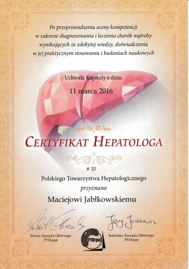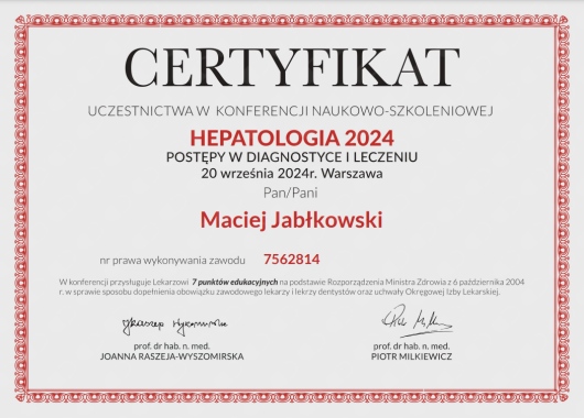 Jaki jest zakres porad oferowanych przez Maciej Jabłkowski?Maciej Jabłkowski to internista, hepatolog, lekarz chorób zakaźnych. Na podstawie swojego doświadczenia i wykształcenia Maciej Jabłkowski oferuje usługi takie jak: konsultacja internistyczna, konsultacja hepatologiczna (pierwsza wizyta), konsultacja hepatologiczna (kolejna wizyta), konsultacja lekarza chorób zakaźnych (pierwsza wizyta), konsultacja lekarza chorób zakaźnych (kolejna wizyta), konsultacja lekarza medycyny podróży, Konsultacja lekarza z badaniem Fibroscan.