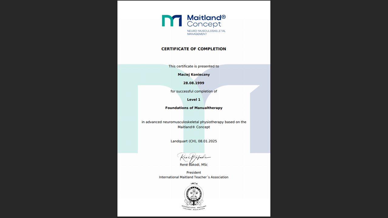 -Dyplom Koncepcji terapii manualnej Maitlanda z akredytacją Międzynarodowej Federacji Ortopedycznych Fizjoterapeutów Manualnych (IFOMPT)