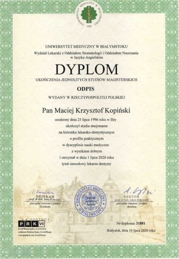 Dla Pana Doktora Kopińskiego nie znajduję słów podziękowania. Jest osobą niezwykłą, miłą i uprzejmą.Chylę czoła przed jego wiedzą i zaangażowaniem w sprawy pacjenta. Do Doktora Macieja trafiłem, po 5 konsultacjach z innymi lekarzami. Wszyscy jednoznacznie orzekli, iż moja 6 górna jest do usunięcia, bo to trudny ząb i nikłe szanse na uratowanie. W akcie desperacji, postanowiłem odwiedzić jeszcze jednego lekarza, którego polecili mi moi znajomi. Właściwie nie miałem już żadnej nadziei, iż usłyszę coś na pocieszenie. I tu się pozytywnie zaskoczyłem. Pan doktor powiedział, że podejmie próbę ratowania mojego zęba. Cały proces trwał ponad rok i obarczony był ryzykiem utraty zęba. Jednak dziś mój ząb jest na swoim miejscu, wyleczony i okoronowany. Gdyby nie doktor Maciej byłby tylko wspomnieniem. Dziękuję bardzo Panie doktorze. Niezwykle miło było mi Pana odwiedzać.