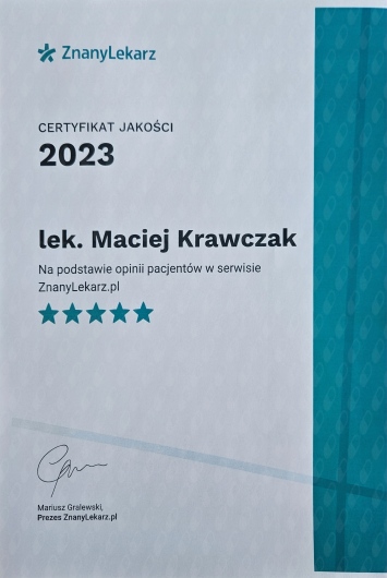 Jak Maciej Krawczak umawia wizyty?Maciej Krawczak używa kalendarza ZnanyLekarz, dlatego na stronie widzisz aktualne terminy. Wystarczy, że wybierzesz datę i godzinę, które odpowiadają Ci najbardziej. Umawianie wizyty jest darmowe, a tuż przed terminem wyślemy Ci przypomnienie.