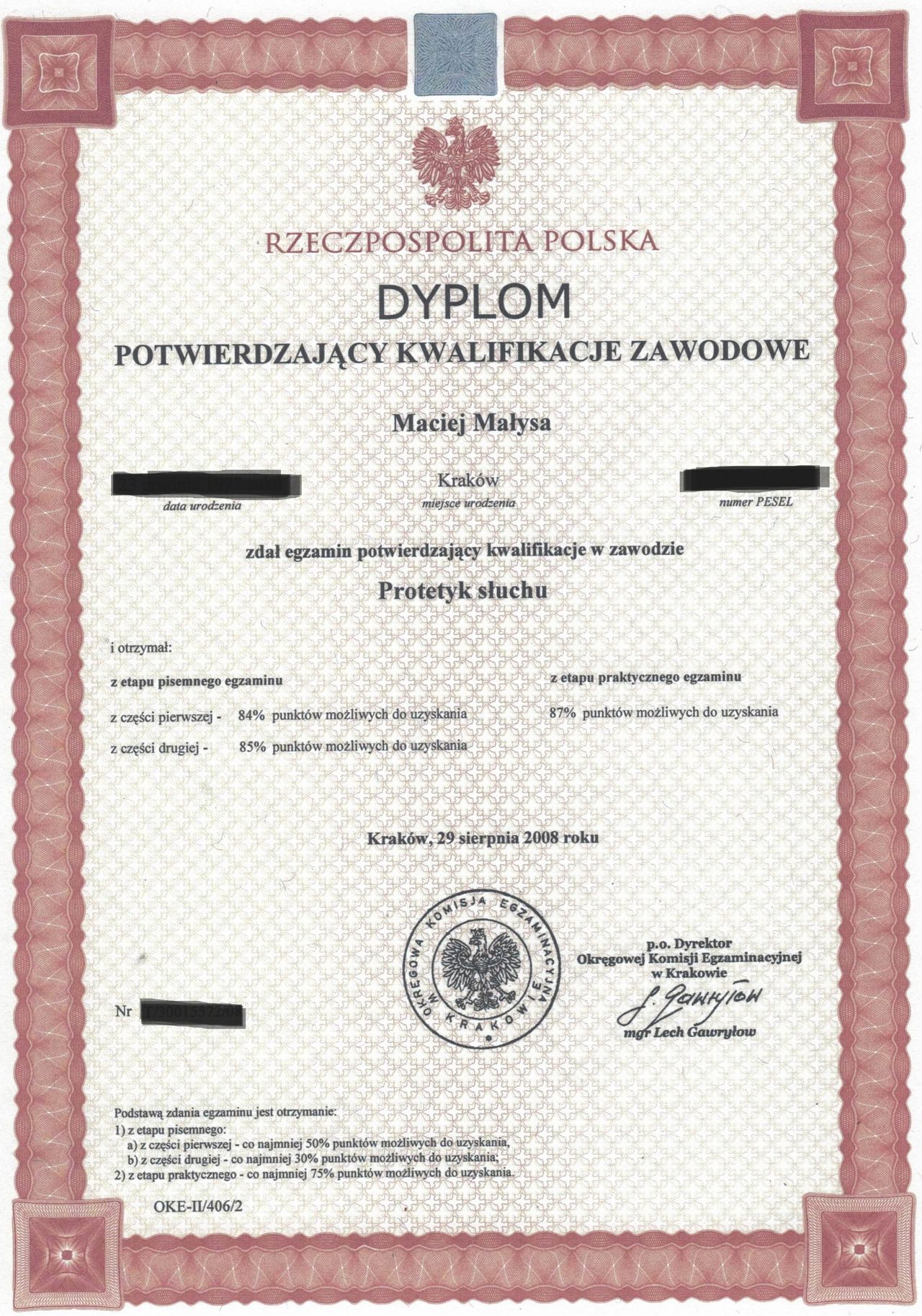 Jestem dyplomowanym protetykiem słuchu . W zawodzie pracuję od 20 lat. Zajmuję się szeroko pojętą diagnostyką słuchu oraz doborem i dopasowaniem aparatów słuchowych. Przez wiele lat pracowałem w Uniwersyteckim szpitalu Dziecięcym w Prokocimiu gdzie zajmowałem się protezowaniem aparatami słuchowymi dzieci i niemowląt. Obecnie prowadzę własny gabinet protetyki i diagnostyki słuchu gdzie zajmuję się zarówno najmłodszymi pacjentami ( od pierwszych tygodni życia ) po pacjentów w podeszłym wieku. Zajmuję się także diagnostyką wyższych funkcji słuchowych CAPD. Jestem terapeutą I stopnia EEG biofeedback.