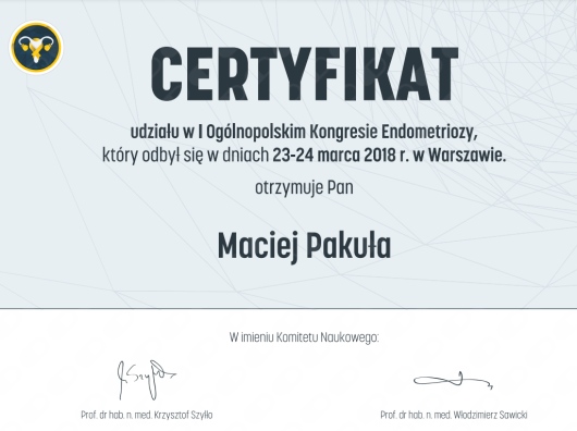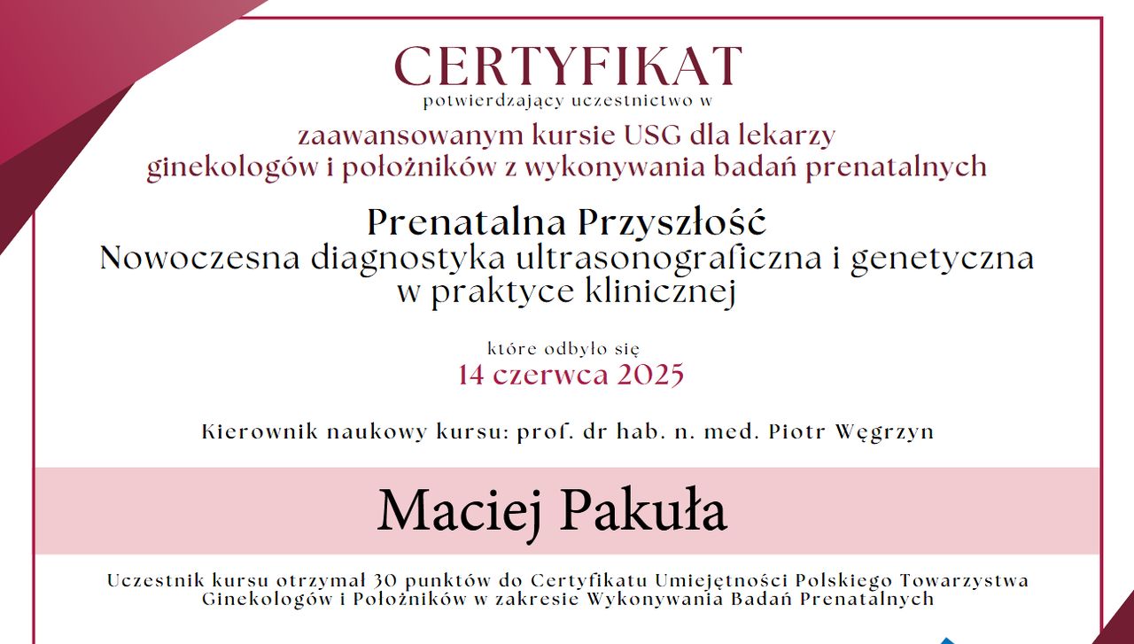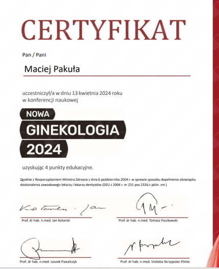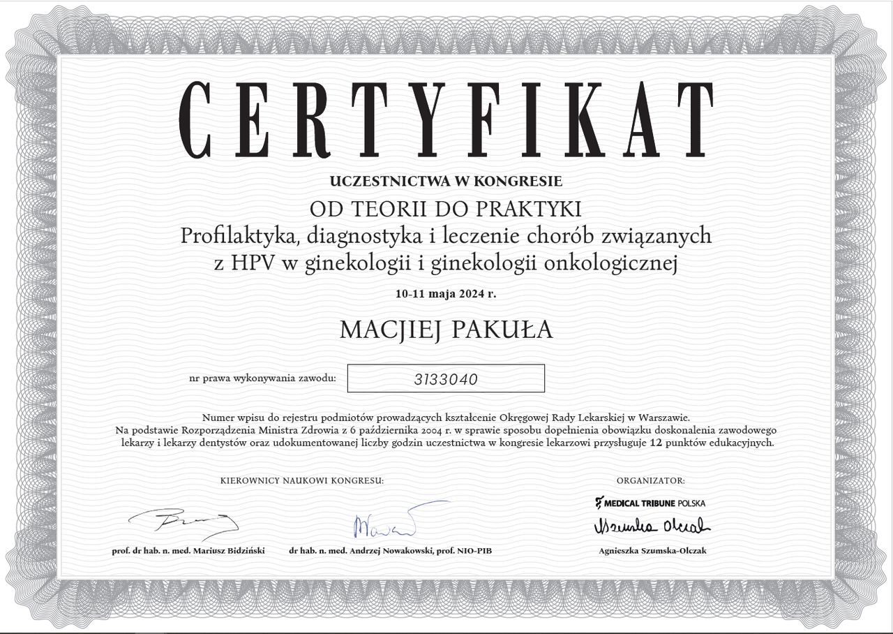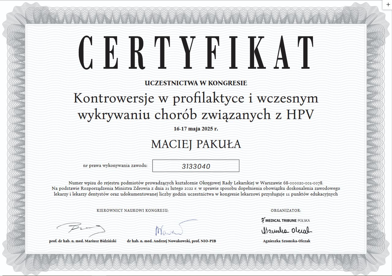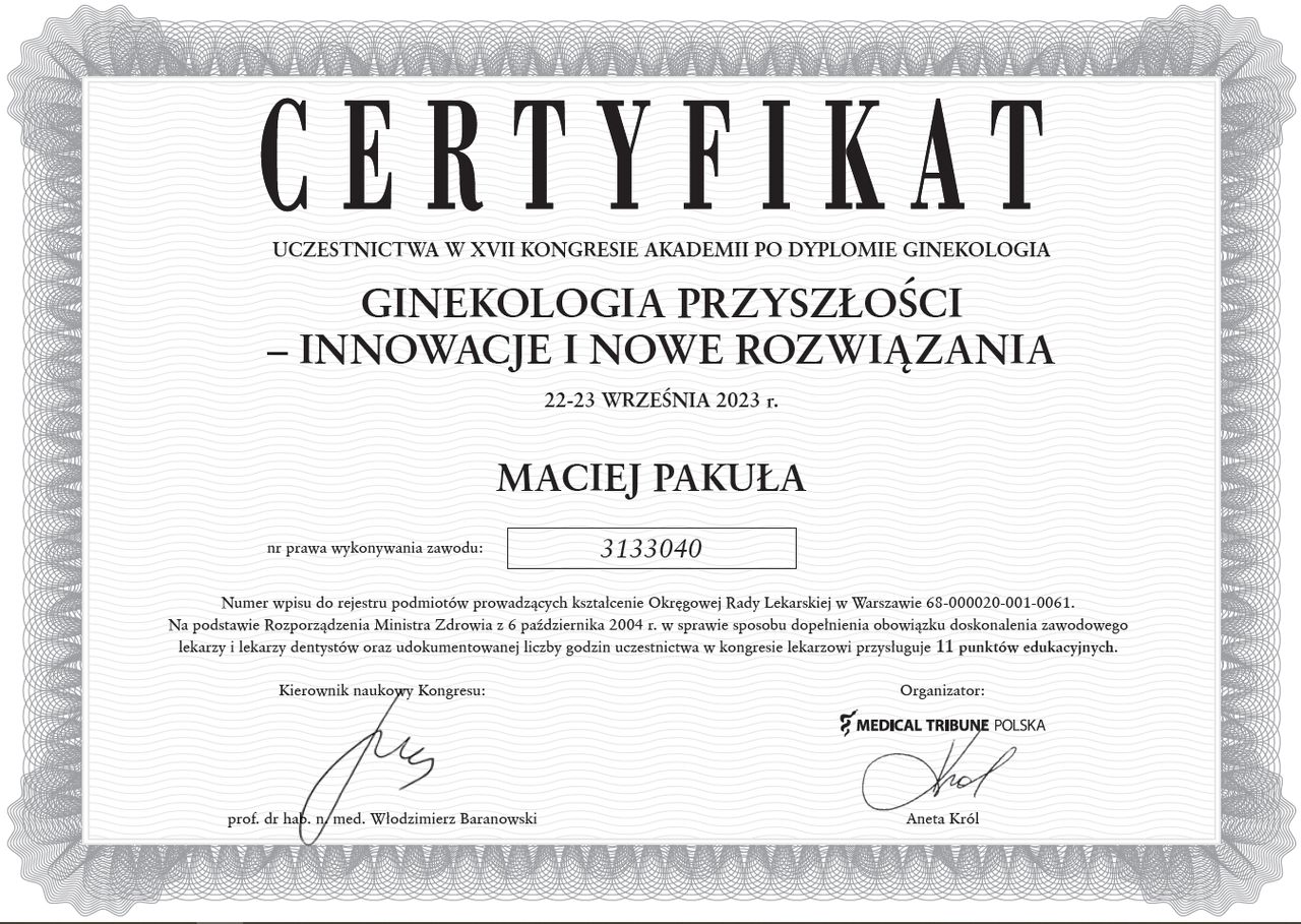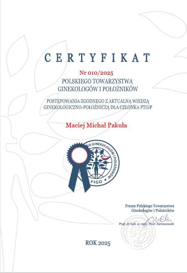Jaki jest zakres porad oferowanych przez Maciej Michał Pakuła?Maciej Michał Pakuła to ginekolog, lekarz wykonujący zabiegi medycyny estetycznej. Na podstawie swojego doświadczenia i wykształcenia Maciej Michał Pakuła oferuje usługi takie jak: konsultacja ginekologiczna, USG ginekologiczne transvaginalne, usg narządów rodnych przez powłoki brzuszne, USG ciąży do 11 tyg., konsultacja położnicza, konsultacja leczenia niepłodności, konsultacja położnicza + USG, konsultacja położnicza + cytologia, Badanie ginekologiczne + USG + Cytologia, diagnostyka niepłodności.