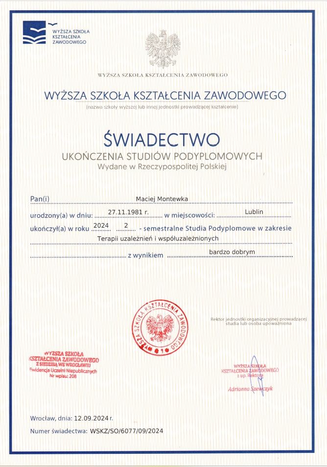 Moje doświadczenie wzbogacają międzynarodowe szkolenia – dwukrotnie otrzymałem stypendium naukowe w Austrii, gdzie szkoliłem się pod okiem specjalistów z Columbia University i Memorial Sloan Kettering Cancer Center. Posiadam tytuł doktora nauk medycznych oraz regularnie podnoszę kwalifikacje w zakresie psychiatrii i leczenia uzależnień.