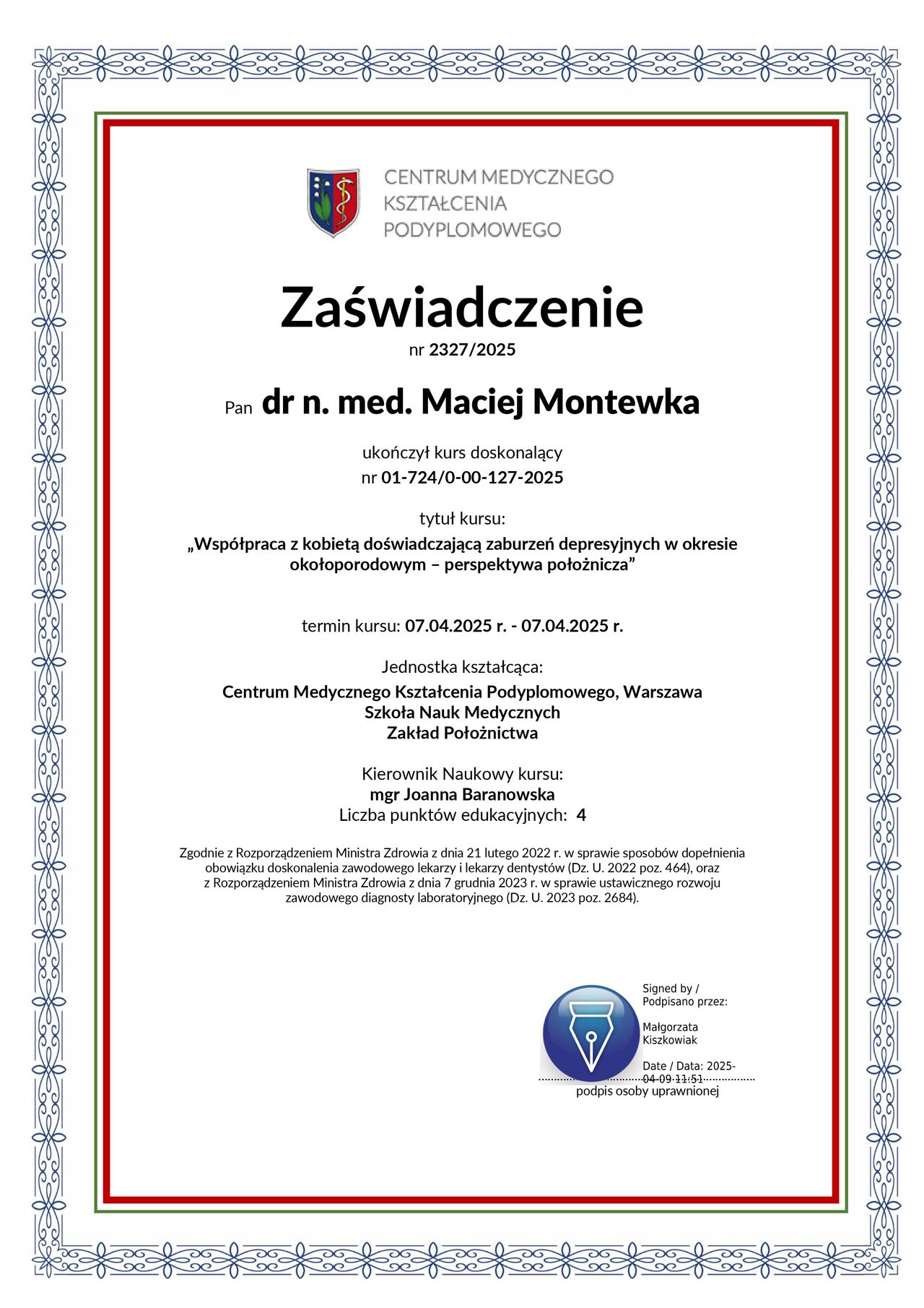 Jaki jest zakres porad oferowanych przez Maciej Montewka?Maciej Montewka to w trakcie specjalizacji (psychiatra), ginekolog. Na podstawie swojego doświadczenia i wykształcenia Maciej Montewka oferuje usługi takie jak: konsultacja psychiatryczna, leczenie depresji(wizyta pierwszorazowa), diagnoza depresji, leczenie depresji (kolejna wizyta), terapia uzależnień, kolejna wizyta psychiatryczna - leczenie, konsultacja psychiatryczna (kolejna wizyta), terapia uzależnień (kolejna wizyta), terapia uzależnień (pierwsza wizyta), Diagnoza cPTSD.