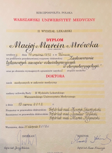 Od 1998 roku jestem pracownikiem Instytutu Fizjologii i Patologii Słuchu w Warszawie, od wielu lat ordynatorem w Klinice Otorynolaryngochirurgii Światowego Centrum Słuchu w Kajetanach lecząc (głównie operując) pacjentów w każdym wieku. Ze względu na specyfikę pracy w Kajetanach, mam duże doświadczenie operacyjne (kilkadziesiąt tysięcy operacji). Jestem autorem i współautorem publikacji medycznych krajowych i zagranicznych, oraz doniesień zjazdowych. Posiadam tytuł doktora nauk medycznych (Warszawski Uniwersytet Medyczny), oraz doktora nauk humanistycznych w dyscyplinie filozofia [etyka] (Uniwersytet Warszawski).
