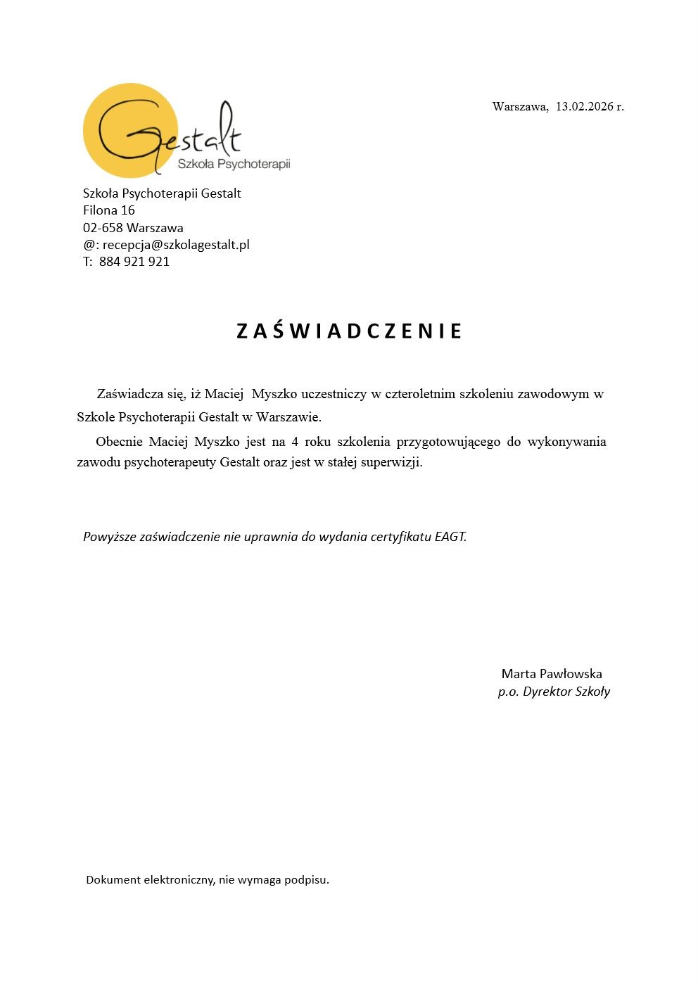 Czy Maciej Myszko przyjmuje online, bez konieczności pojawiania się w placówce?Tak, Maciej Myszko oferuje konsultacje online. Wybierz opcję „konsultacja online” przy umawianiu wizyty, a zobaczysz dostępne terminy.