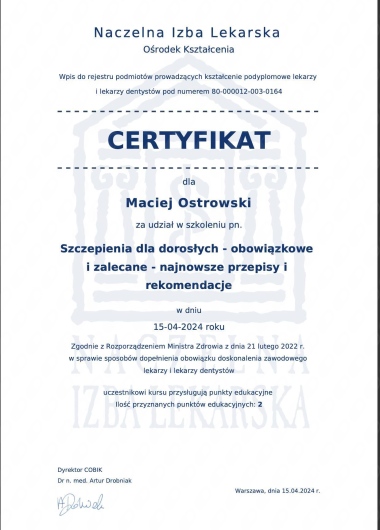 Jestem absolwentem Akademii Medycznej we Wrocławiu. W 2019 roku zakończyłem specjalizację z zakresu Pediatrii w Szpitalu im. Św. Jadwigi w Trzebnicy. W roku 2023 dodatkowo uzyskałem tytuł specjalisty chorób płuc dzieci. Od ponad 10 lat udzielam konsultacji pediatrycznych w placówkach takich jak Enel-Med, Medicover, DSCM Brzeg Dolny.