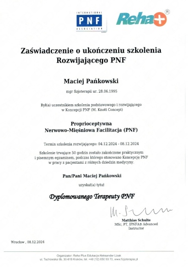 Jaki jest zakres porad oferowanych przez Maciej Pańkowski?Maciej Pańkowski to fizjoterapeuta. Na podstawie swojego doświadczenia i wykształcenia Maciej Pańkowski oferuje usługi takie jak: rehabilitacja sportowców, taping (plastrowanie), rehabilitacja domowa, ćwiczenia, konsultacja fizjoterapeutyczna (pierwsza wizyta), terapia mięśniowo-powięziowa, Terapia bólu, Masaż leczniczy, rehabilitacja pourazowa, Drenaż limfatyczny.