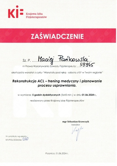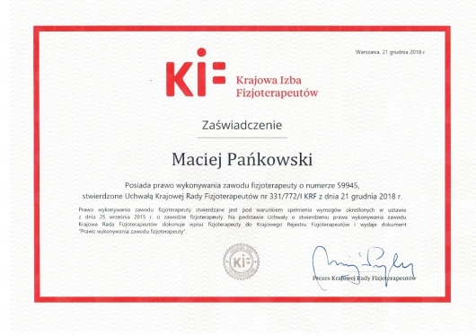 Uwielbiam swoją pracę, ponieważ daje mi wiele możliwości rozwoju, a przywrócenie komuś sprawności dostarcza ogromnej satysfakcji. Mam doświadczenie treningowe w wielu dyscyplinach sportowych. Cały czas się dokształcam, ukończyłem wiele kursów specjalistycznych, zarówno stacjonarnych, jak i online, uczestniczę w konferencjach oraz regularnie biorę udział w webinarach. Co jakiś czas fascynuję się nowym obszarem zdrowia, który intensywniej zgłębiam; aktualnie moją pasją jest oddech.