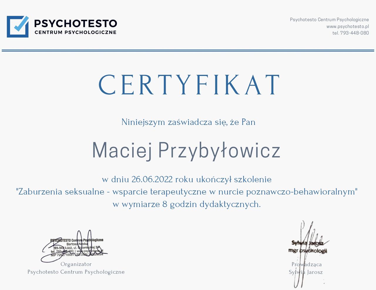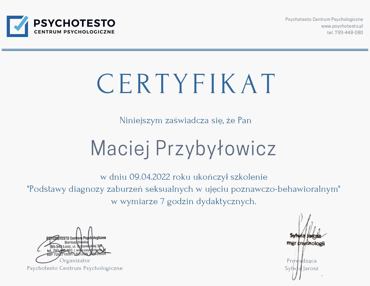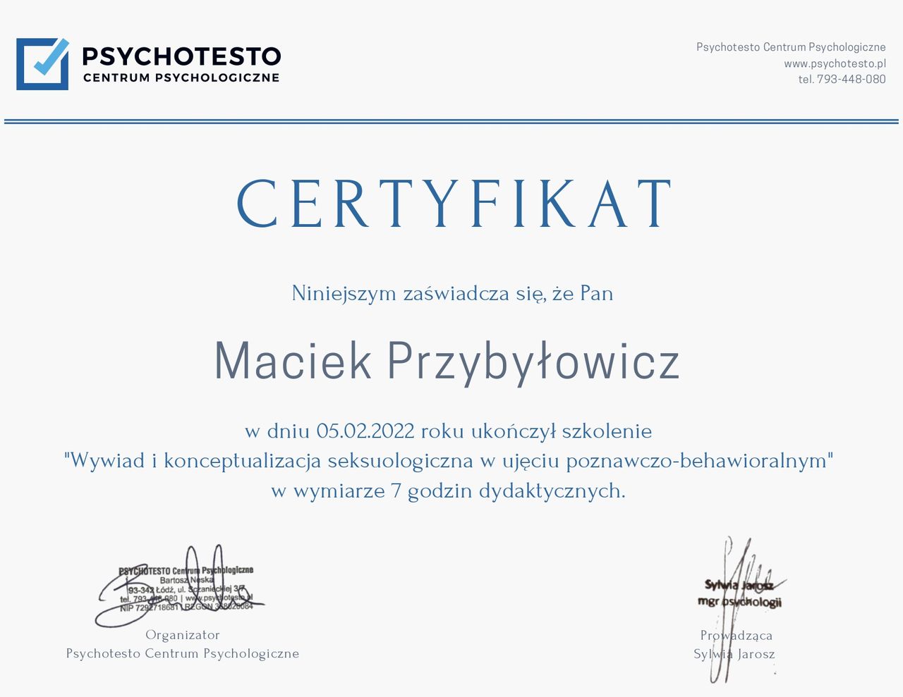 Psychologię ukończyłem na Uniwersytecie Jagiellońskim w Krakowie, Seksuologię kliniczną na Uniwersytecie SWPS w Katowicach. Obecnie jestem w trakcie czteroletniej Szkoły Psychoterapii Poznawczo-Behawioralnej Uniwersytetu SWPS pod kierownictwem dr hab. Agnieszki Popiel i dr Ewy Pragłowskiej w Krakowie, uprawniającej do uzyskania certyfikatów Polskiego Towarzystwa Terapii Poznawczej i Behawioralnej oraz European Association for Behavioural and Cognitive Therapies.