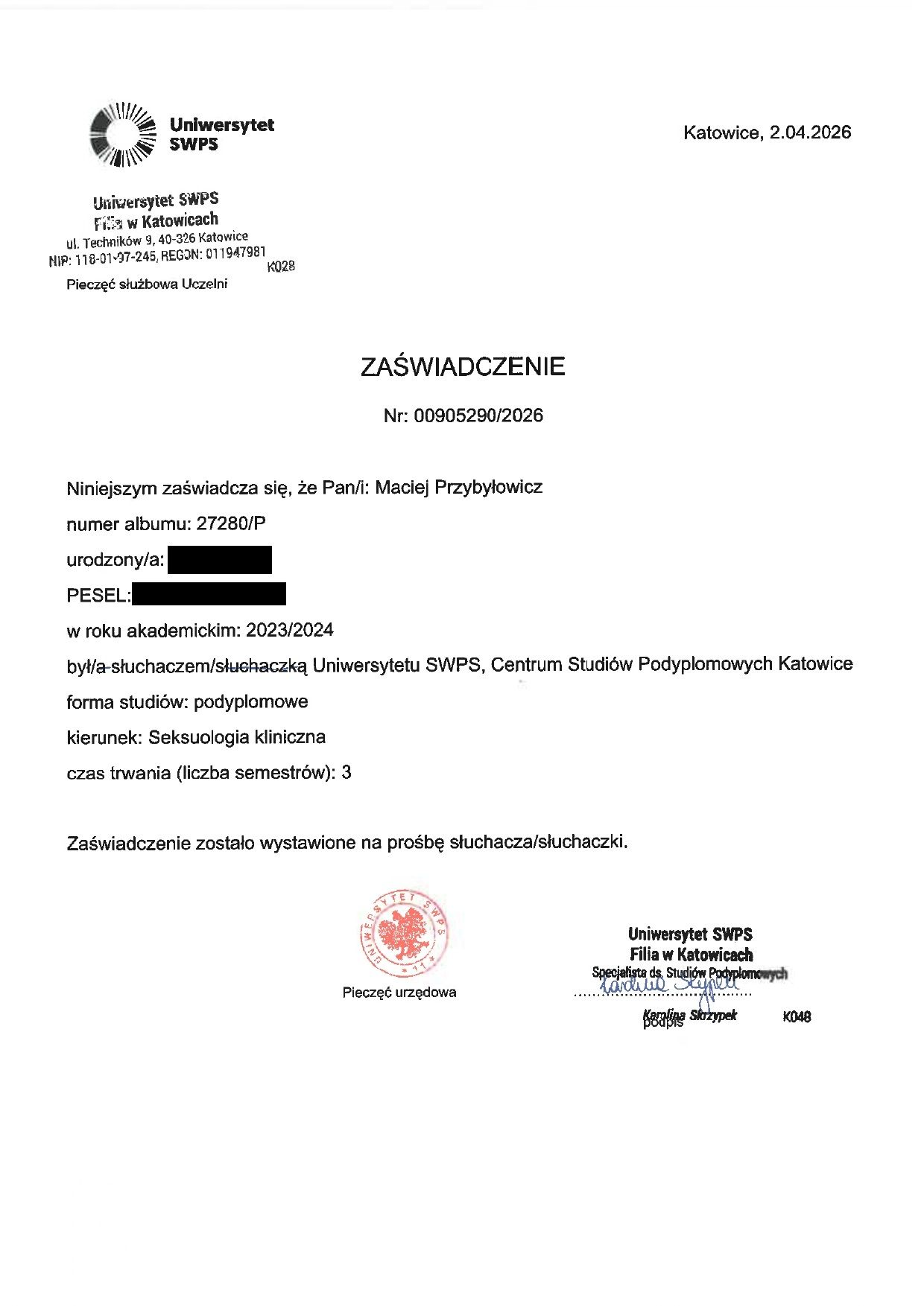 Zgłosiłem się do Pana Macieja po opinię potrzebną do rozpoczęcia HRT. Od początku wszystko było jasno i spokojnie wyjaśnione, zarówno przebieg spotkań, jak i cały proces opiniowania. Specjalista wykazał się dużym profesjonalizmem i empatią. Atmosfera podczas wizyt była bardzo komfortowa i sprzyjała rozmowie. Spotkania były uporządkowane, rzeczowe i prowadzone w przyjazny sposób, a kontakt poza nimi szybki i wygodny. Doceniam przede wszystkim cierpliwość, szczegółowe tłumaczenie każdego etapu oraz zaangażowanie. Zdecydowanie polecam jako kompetentnego i wspierającego seksuologa.