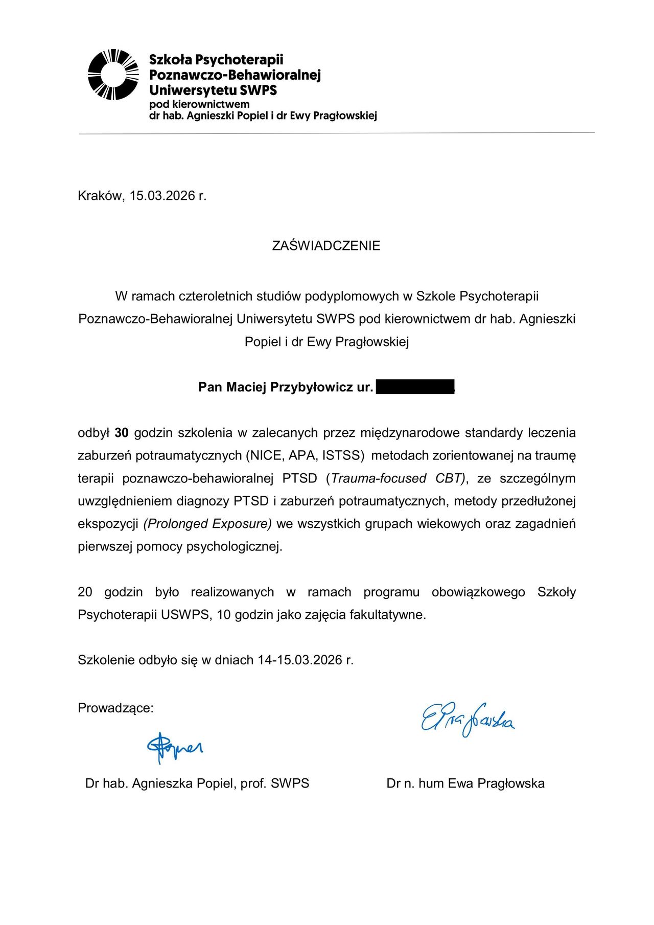 Poza podejściem poznawczo-behawioralnym wprowadzam elementy Terapii Schematów, Terapii Akceptacji i Zaangażowania, Terapii opartej na współczuciu oraz Terapii opartej na uważności. Pomogę Ci w powrocie do zdrowia i zwiększeniu satysfakcji z życia. Odbyłem szkolenie w zalecanych przez międzynarodowe standardy metodach leczenia zaburzeń potraumatycznych zorientowanej na traumę terapii poznawczo-behawioralne.
