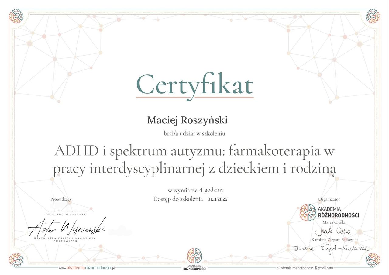 Czy Maciej Roszyński przyjmuje online, bez konieczności pojawiania się w placówce?Tak, Maciej Roszyński oferuje konsultacje online. Wybierz opcję „konsultacja online” przy umawianiu wizyty, a zobaczysz dostępne terminy.