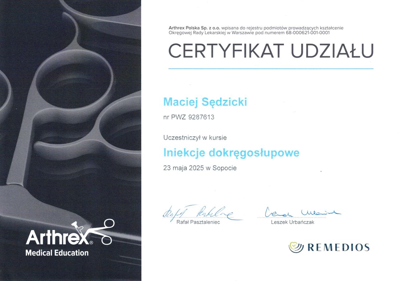 Specjalista Ortopedii i Traumatologii Narządu Ruchu. Członek Polskiego Towarzystwa Artoskopowego i Polskiego Towarzystwa Barku i Łokcia. • Zajmuję się diagnostyką oraz leczeniem chorób i urazów narządu ruchu. Wykonuję zabiegi operacyjne techniką klasyczną oraz artroskopową. Wykonuję usg ortopedyczne i podaje leki dostawowo pod kontrolą USG - w każdym gabinecie w którym przyjmuję jest możliwość wykonania USG. Stosuję także nowoczesne metody leczenia biologicznego - osocze bogatopłytkowe PRP oraz terapię Orthokine. Wykonuję artroskopię stawu kolanowego, artroskopię stawu skokowego, rekonstrukcję więzadła krzyżowego przedniego ( ACL ), artroskopię barku, operację paluchów koślawych, operację zespołu cieśni nadgarstka, operację palca trzaskającego, operację uszkodzonego ścięgna Achillesa, operacyjne leczenie palucha sztywnego z użyciem nowoczesnego implantu Reg Joint. itp. Zabiegi operacyjne wykonuje w szpitalu Luxmed ul. Wileńska 44 w Gdańsku, w Klinice Chirurgii Jednego Dnia Perfect Medica ul. Kołobrzeska 63 D w Gdańsku i w Grand Medical Clinic ul Brzezińska 5/15 w Łodzi. Specjalizację uzyskałem w Klinice Ortopedii i Ortopedii Dziecięcej w Łodzi - dawny szp. Radlińskiego Łódź Drewnowska 75. Stopień doktora nauk medycznych uzyskałem w grudniu 2024