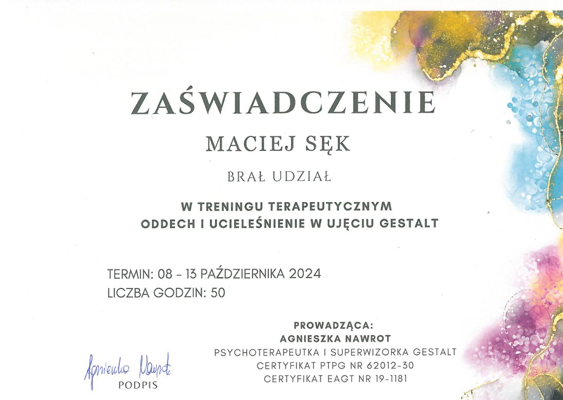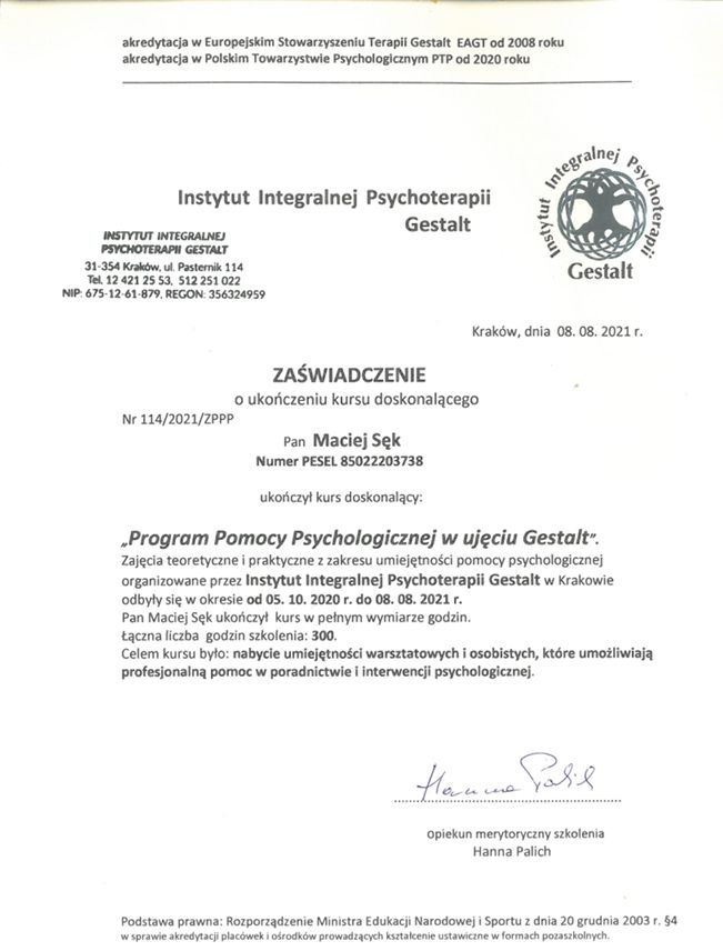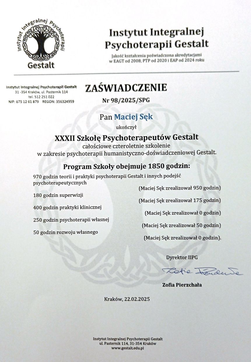 Nazywam się Maciek Sęk i jestem psychoterapeutą Gestalt. Od wielu lat pracuję w obszarach pomocy psychologicznej i psychoterapii. Pracuję z osobami dorosłymi indywidualnie i prowadząc grupy, a swoją pracę poddaję regularnej superwizji. Specjalizuję się w pomocy osobom cierpiącym z powodu: – depresji – lęków – stresu – braku poczucia własnej wartości – kryzysów życiowych – problemów w relacjach osobistych i zawodowych Pomagam też osobom, które nie umieją jeszcze nazwać powodów własnego cierpienia, a potrzebują wiedzy, wsparcia i akceptacji na drodze do samopoznania i zmiany. Umiejętności zawodowe zdobywałem na akredytowanej w EAGT i spełniającej wymogi PTPG, 4-letniej podyplomowej Szkole Psychoterapeutów i Trenerów Grupowych w Instytucie Integralnej Psychoterapii Gestalt (IIPG) w Krakowie, a także w akredytowanym w EAGT specjalistycznym Programie Pomocy Psychologicznej w ujęciu Gestalt. Dodatkowo, ukończyłem wiele szkoleń doskonalących kwalifikacje specjalistyczne. Od 3 lat współprowadzę Ośrodek Psychoterapii Świadomość i Rozwój, którego jestem założycielem, i w którym prowadzę grupy terapeutyczne oraz terapię indywidualną. Po zapisaniu się na wizytę przez portal, recepcja Ośrodka "Świadomość i Rozwój" skontaktuje się z państwem w sprawie potwierdzenia terminu.