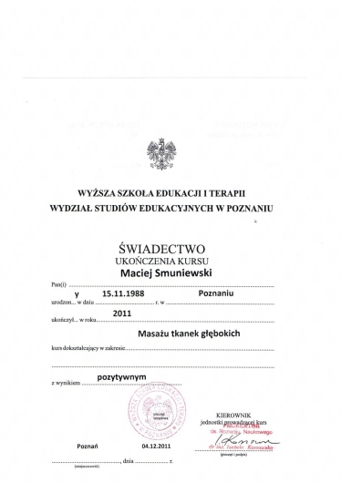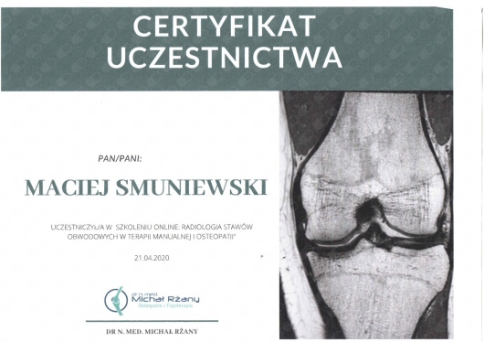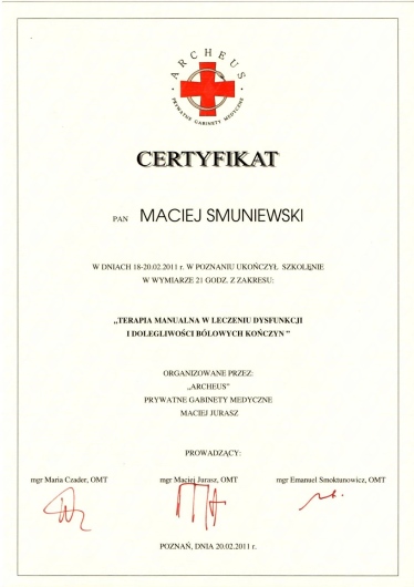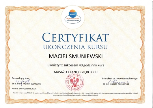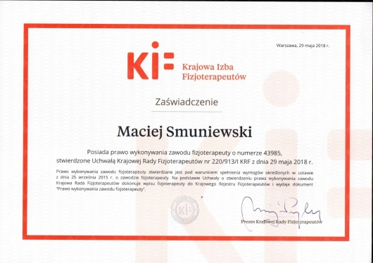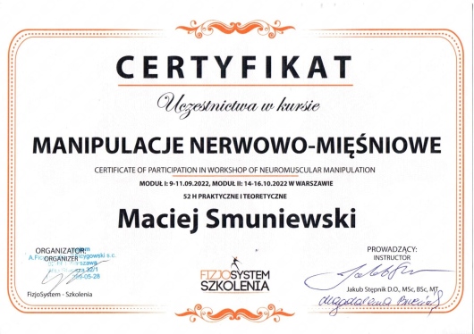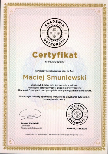 Jaki jest zakres porad oferowanych przez Maciej Smuniewski?Maciej Smuniewski to osteopata, fizjoterapeuta. Na podstawie swojego doświadczenia i wykształcenia Maciej Smuniewski oferuje usługi takie jak: osteopatia, konsultacja fizjoterapeutyczna, rehabilitacja pourazowa, rehabilitacja pooperacyjna, Terapia manualna, fizjoterapia, terapia wisceralna, rehabilitacja, wizyta osteopatyczna pierwsza, terapia manualna (pierwsza wizyta).