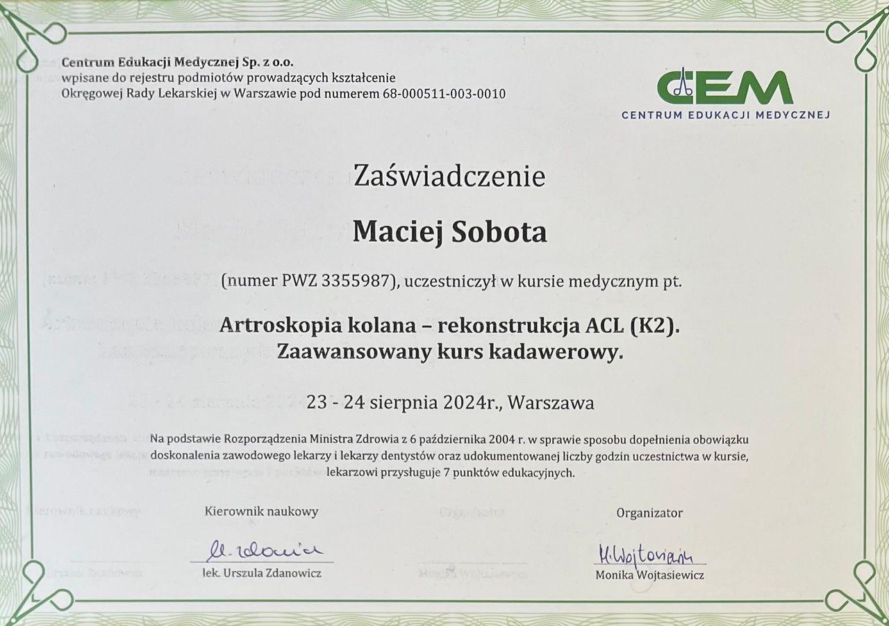 3. Artroskopia kolana - rekonstrukcja ACL. Zaawansowany kurs kadawerowy. CEM, Warszawa