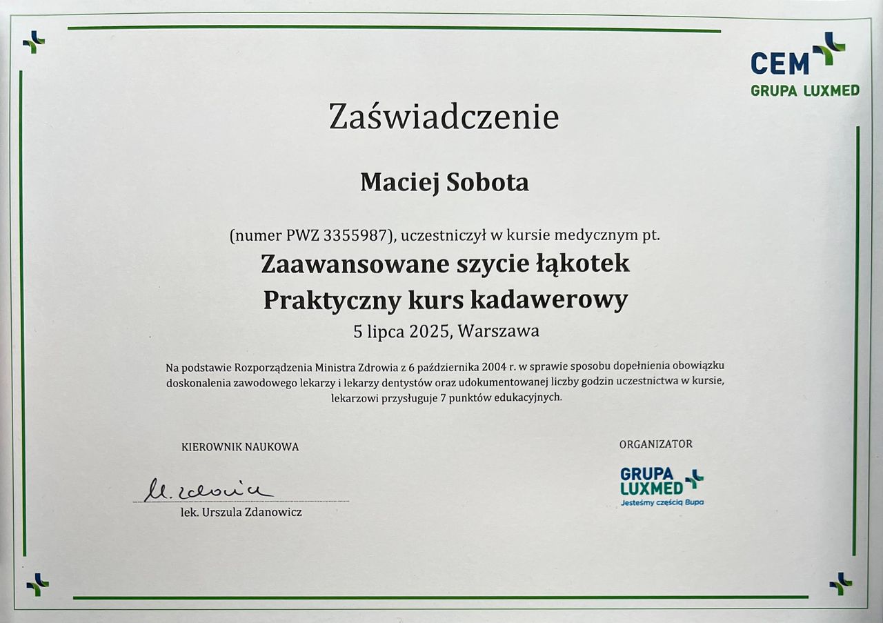 Lekarz z profesjonalnym podejściem do pacjenta.Prawdziwy fachowiec z zaangażowaniem i empatią. Dziś już jestem po udanej rekonstrukcji Acl i szyciu łąkotki wykonanej przez Pana Sobotę.Oby więcej takich lekarzy z powołania!