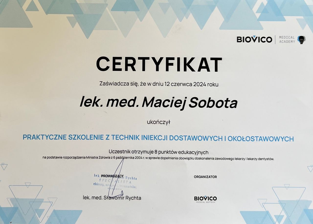 Jaki jest zakres porad oferowanych przez Maciej Sobota?Maciej Sobota to w trakcie specjalizacji (ortopeda). Na podstawie swojego doświadczenia i wykształcenia Maciej Sobota oferuje usługi takie jak: konsultacja ortopedyczna, konsultacja ortopedyczna + USG, iniekcje, Podanie kwasu hialuronowego do stawu, Punkcja stawu.
