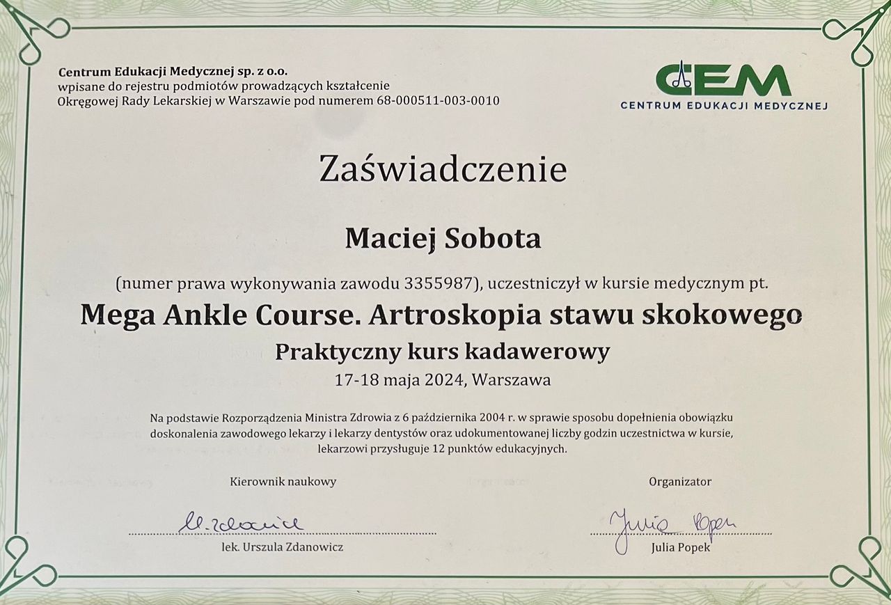 2. Mega Ankle Course. Artroskopia stawu skokowego. Praktyczny kurs kadawerowy. CEM, Warszawa