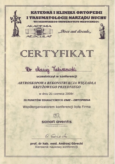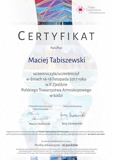 Jestem członkiem Polskiego Towarzystwa Artroskopowego Członek Polskiego Towarzystwa Ortopedycznego i Traumatologicznego Członek European Society for Sports Traumatology, Knee Surgery and Arthroscopy.