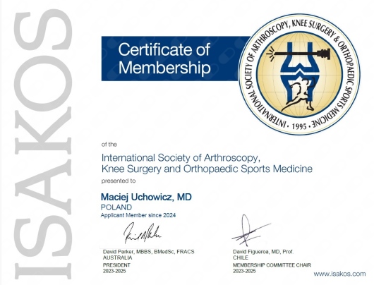 Członkostwo międzynarodowych towarzystw naukowych ISAKOS, ESSKA, AAOS.