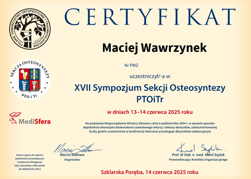 4 opinieJestem lekarzem w trakcie specjalizacji z zakresu ortopedii i traumatologii narządu ruchu. Studia medyczne ukończyłem w 2024 roku na Jessenius Faculty of Medicine in Martin, w trybie anglojęzycznym. Obecnie odbywam szkolenie specjalizacyjne w Szpitalu Chirurgii Urazowej im. J. Daaba w Piekarach Śląskich, gdzie rozwijam swoje umiejętności w zakresie diagnostyki i leczenia urazów oraz schorzeń układu ruchu.