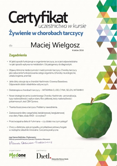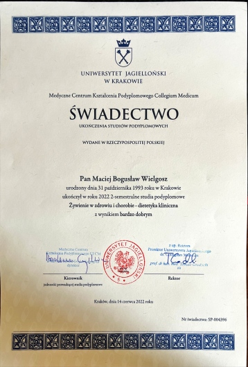 Jestem magistrem inżynierem dietetyki, absolwentem Uniwersytetu Rolniczego w Krakowie i wielu kursów doszkalających. Mam ponad 8-letnie doświadczenie pracy z pacjentami w przychodniach i prywatnych poradniach dietetycznych w Krakowie i okolicach. Specjalizuje się w dietetyce ogólnej (odchudzanie, nabieranie masy ciała), dietetyce klinicznej, dietoterapii w różnych jednostkach chorobowych (cukrzyca, insulinooporność, miażdżyca, nadciśnienie, choroby układu pokarmowego, w tym w zespół jelita drażliwego, refluks czy SIBO, choroby tarczycy, układu nerwowego, alergie, nietolerancje, etc.), a także dobrze czuję się w dietetyce sportowej. Każdego pacjenta traktuję indywidualnie i dostosowuję dietę do konkretnych wymagań i upodobań, a proponowane przeze mnie przepisy są smaczne, proste i szybkie w przygotowaniu. Nie stosuję "gotowców", każdy jadłospis układam indywidualnie dla pacjenta! Więcej na mój temat dowiesz się z mojej strony internetowej.