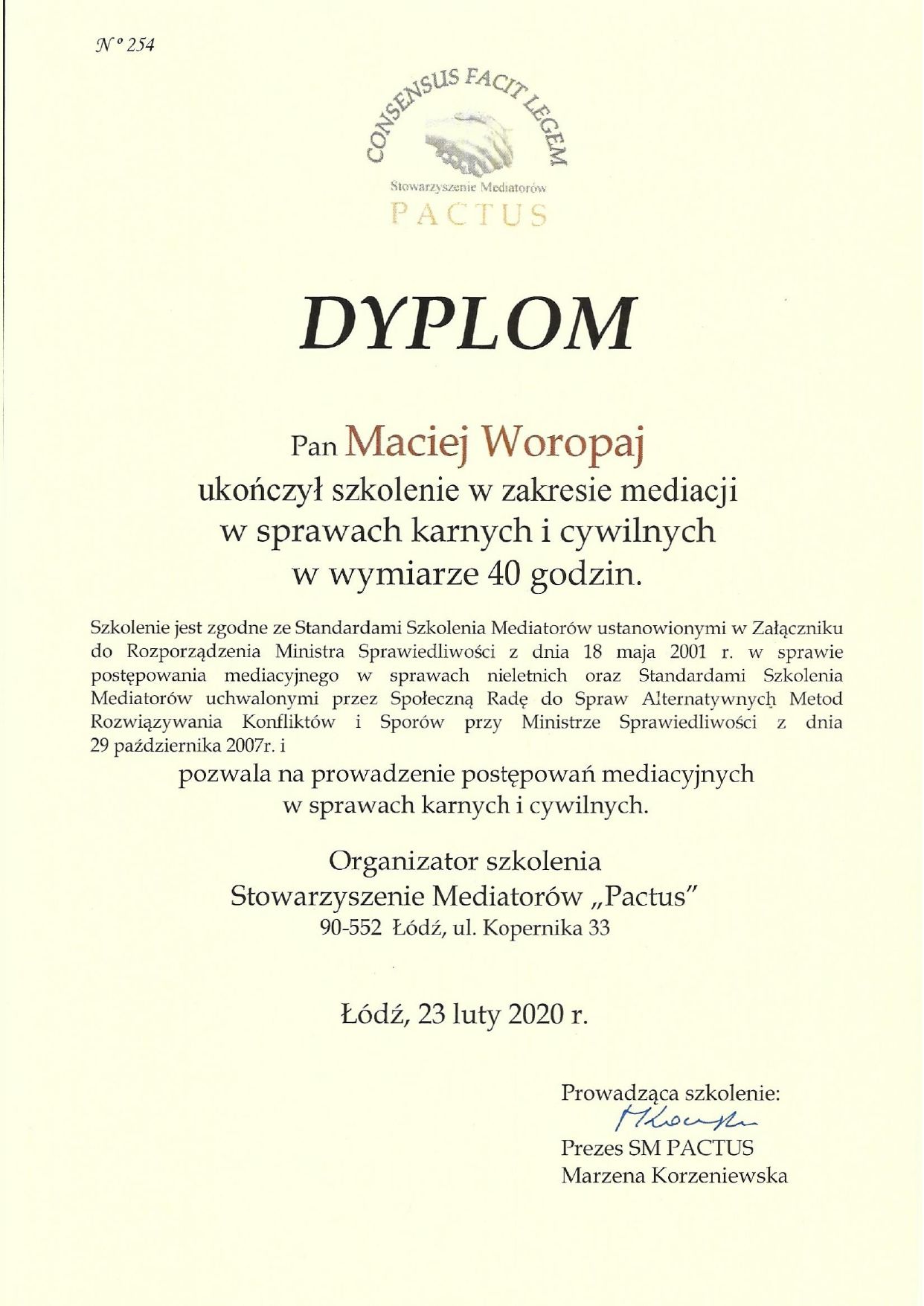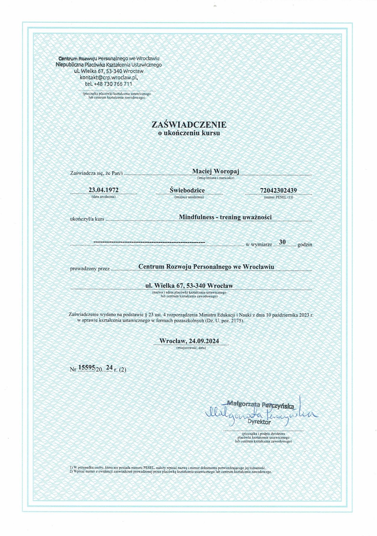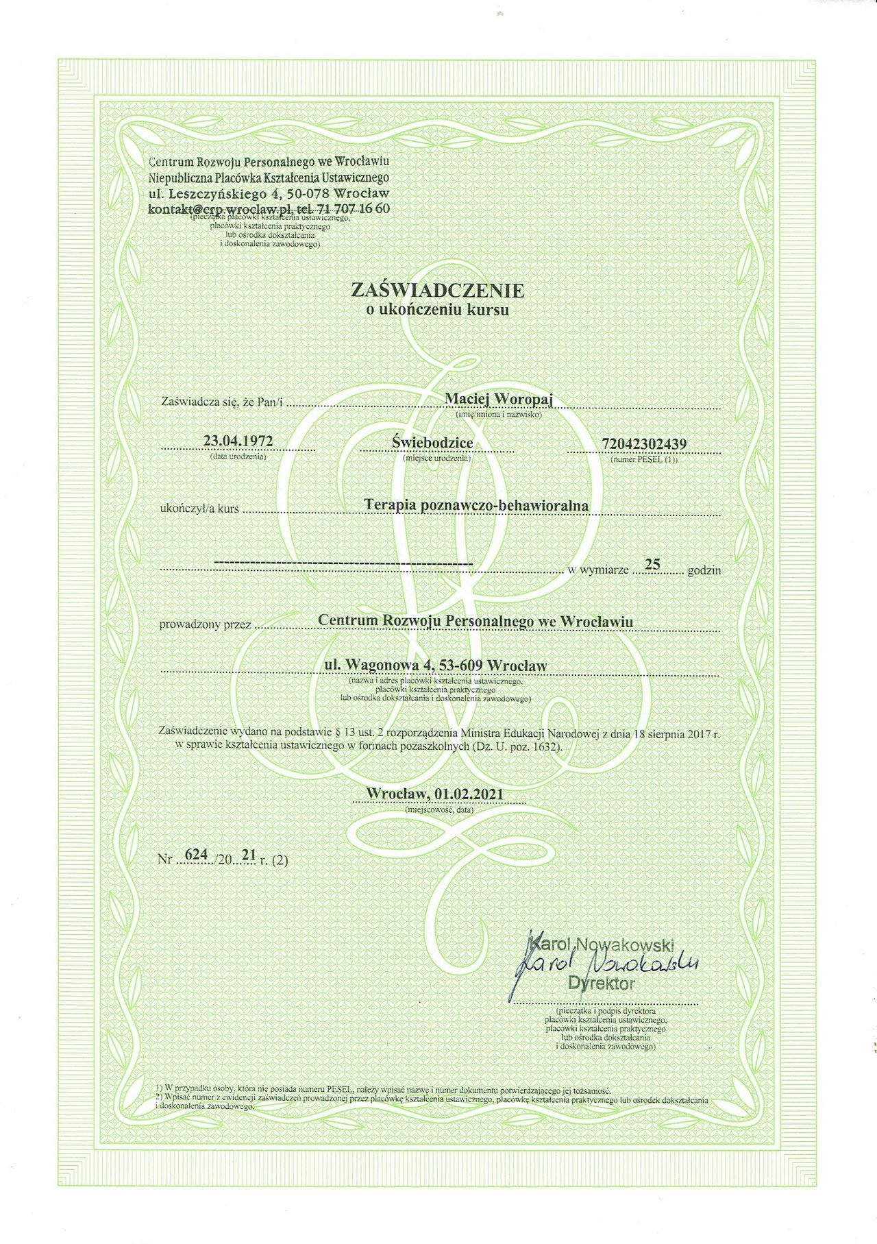 Nazywam się Maciej Woropaj i jestem psychoterapeutą integratywnym w trakcie zaawansowanego, czteroletniego szkolenia w Papieskim Wydziale Teologicznym we Wrocławiu. Jestem też wykształconym coachem, mentorem i trenerem szkoleń, a także mediatorem - z ponad 20 letnim doświadczeniem pracy z ludźmi. Pracuję zarówno indywidualnie jak i w grupach. Od ponad 30 lat jestem aktywnie zaangażowany w różnych przestrzeniach duchowego rozwoju. Dzięki bogatemu doświadczeniu doskonale rozumiem w jakim świecie żyjesz i z jakimi wyzwaniami się mierzysz.