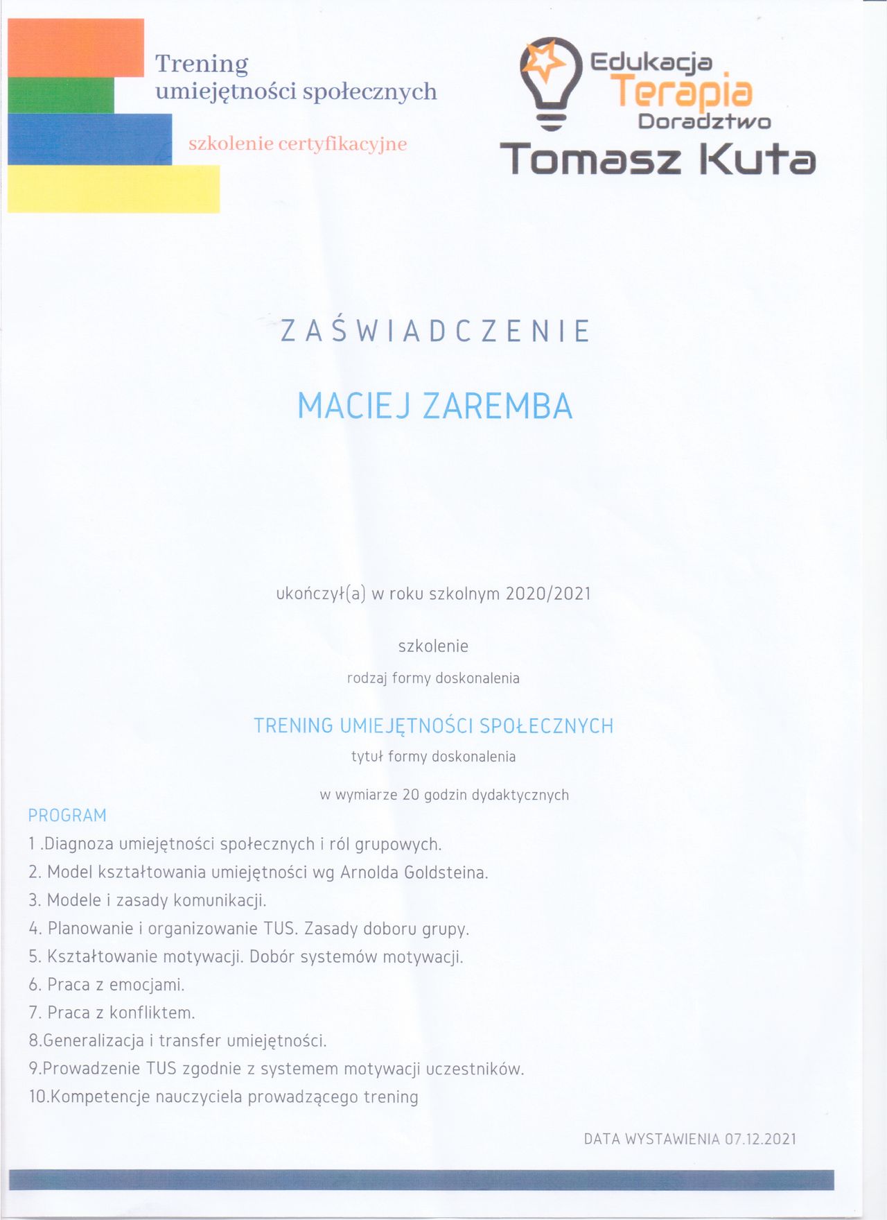 Serdecznie polecam pana Macieja Zaremby. Od pierwszych zajęć stworzył bardzo ciepłą i bezpieczną atmosferę, dzięki czemu moje dziecko szybko poczuło się komfortowo. Terapeuta w jasny sposób tłumaczył, nad czym pracujemy i regularnie informował o postępach. Po kilku miesiącach zauważyliśmy znaczną poprawę . Dziecko jest bardziej otwarte, spokojniejsze i lepiej radzi sobie w trudnych sytuacjach. Jesteśmy bardzo wdzięczni za profesjonalizm, zaangażowanie i empatię.