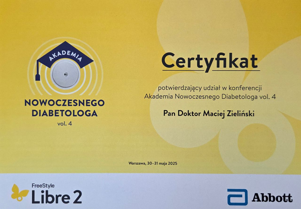 Swoje kwalifikacje podnoszę uczestnicząc regularnie w certyfikowanych kursach, szkoleniach i konferencjach w dziedzinie Diabetologii i Obesitologii, a także w zakresie nowych technologii ( systemy ciągłego monitorowania glikemii).