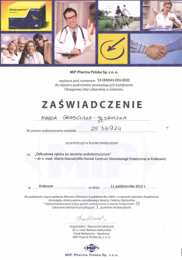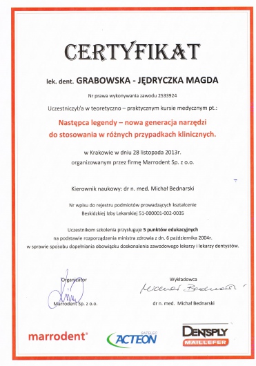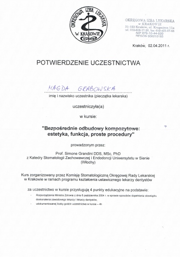 Duża ambicja, ciekawość i zaangażowanie sprawiają, że dąży do pogłębiania wiedzy w wielu dziedzinach stomatologii, ze szczególnym uwzględnieniem endodoncji.