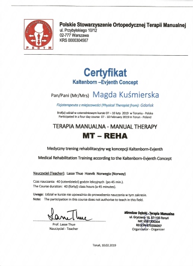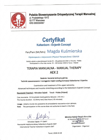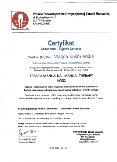 Pani Magda wie co robi i doskonale słucha pacjenta. Dobiera indywidualny program rehabilitacji i zawsze jest pod telefonem gdyby były jakieś pytania. Ja jestem po urazie barku i dzięki rehabilitacji z Panią Magdą bardzo szybko dochodzę do siebie, nawet lekarz ortopeda był zdumiony. Polecam z czystym sercem.