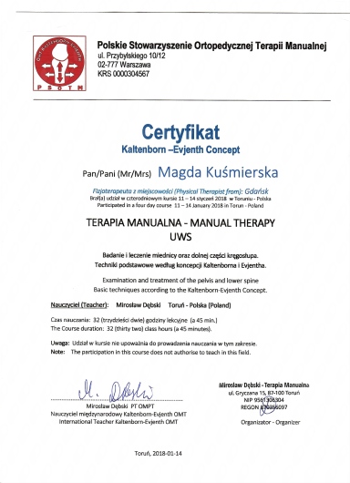 Jaki jest zakres porad oferowanych przez Magda Kuśmierska?Magda Kuśmierska to fizjoterapeuta. Na podstawie swojego doświadczenia i wykształcenia Magda Kuśmierska oferuje usługi takie jak: konsultacja fizjoterapeutyczna, medyczny trening rehabilitacyjny, Terapia manualna, terapia mięśniowo-powięziowa, Terapia tkanek miękkich, rehabilitacja ortopedyczna, rehabilitacja sportowców, fizjoterapia, suche igłowanie, rehabilitacja domowa.